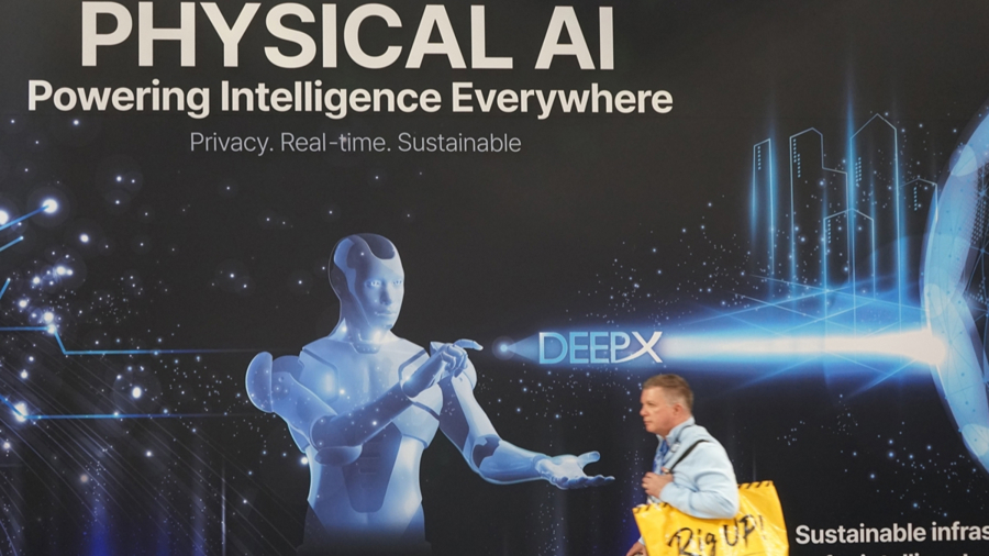 2026年美国拉斯维加斯消费电子展上印有“物理AI”字样的展台。(新华社/曾慧摄)